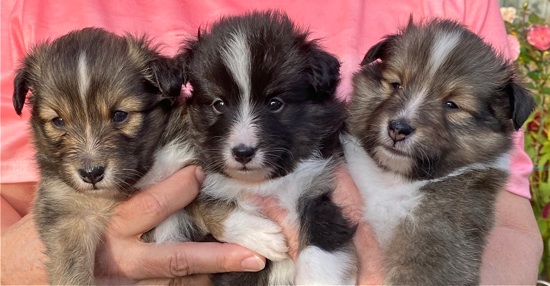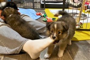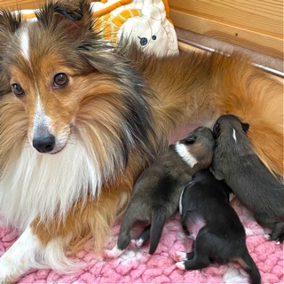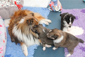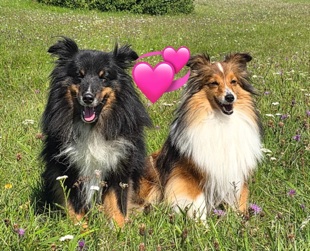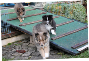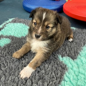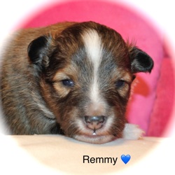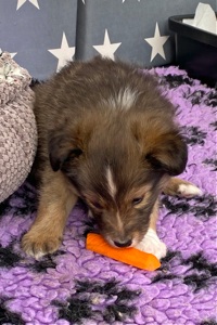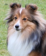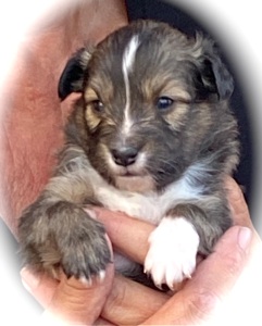 er ist ein sable Rüde, hat auf der Stirn eine weiße Blesse und links eine weiße Halskrause, auf der Vorderpfote links einen weißen Socken, sowie eine