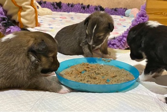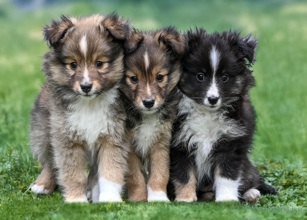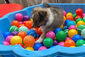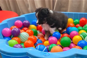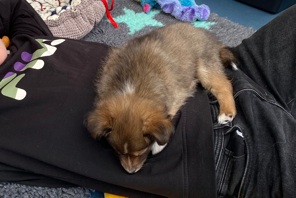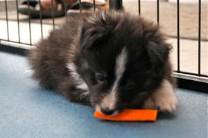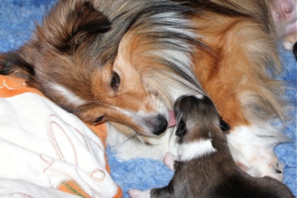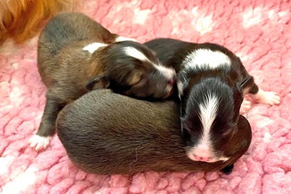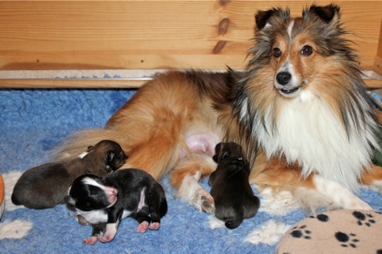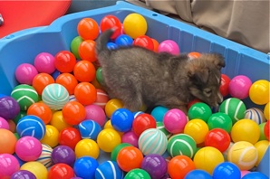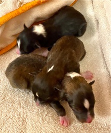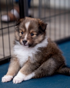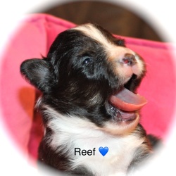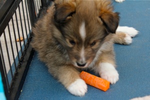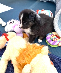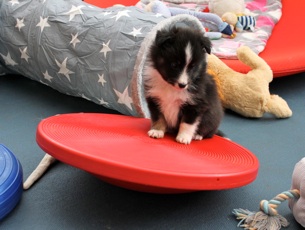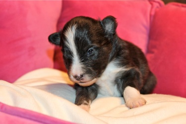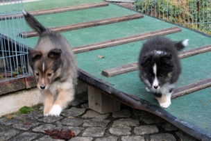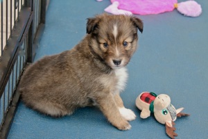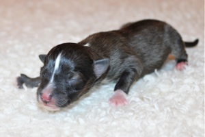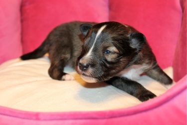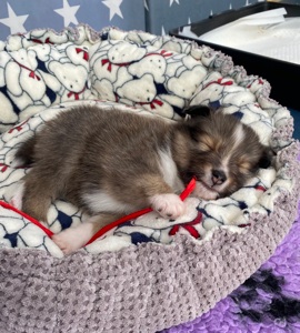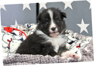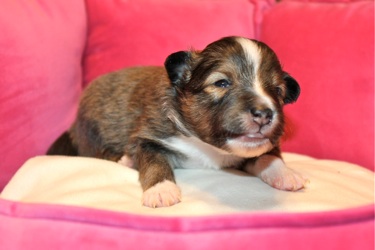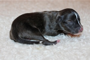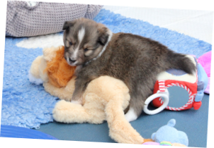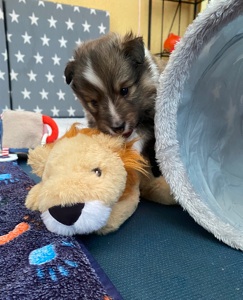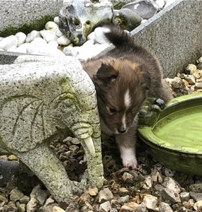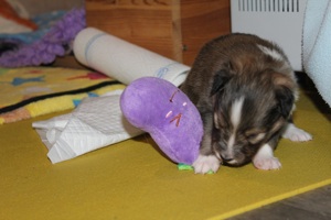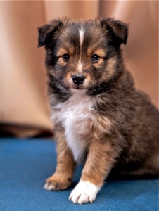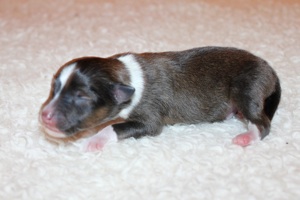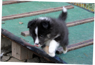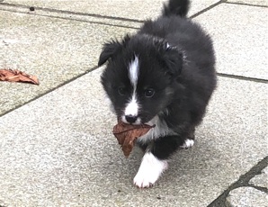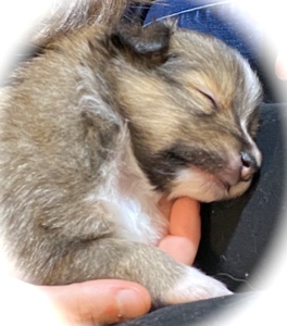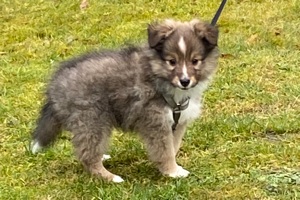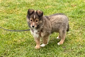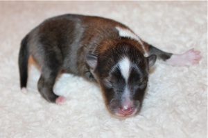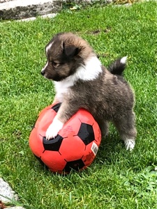 er ist ein sable Rüde, hat auf der Stirn einen weißen Strich und im Nacken einen kleinen weißen Punkt, sowie eine weiße Schwanzspitze. Auf der linken Vorderpfote einen weißen Socken.