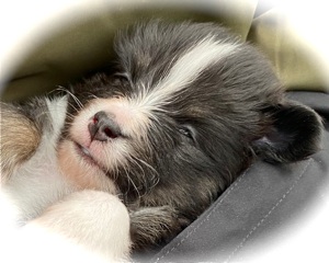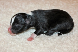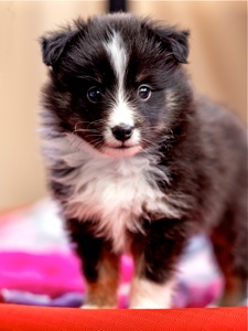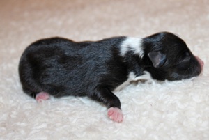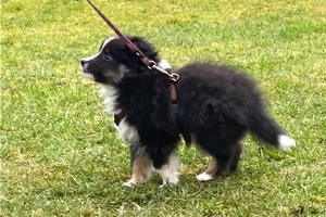er ist ein tricolour Rüde, hat auf der Stirn eine weiße Blesse und im Nacken einen weißen Stern, der nach rechts weiter verläuft. Auf der linken Vorderpfote einen weißen Socken und eine weiße Schwanzspitze